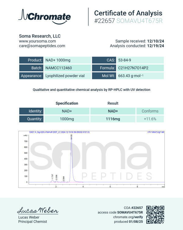 Formulation Notes: NAD⁺ solutions are sensitive to pH, light, and heat. Reconstitute immediately before use, protect from UV exposure, and discard if solution becomes cloudy. Slight yellow hue or crystallization is normal